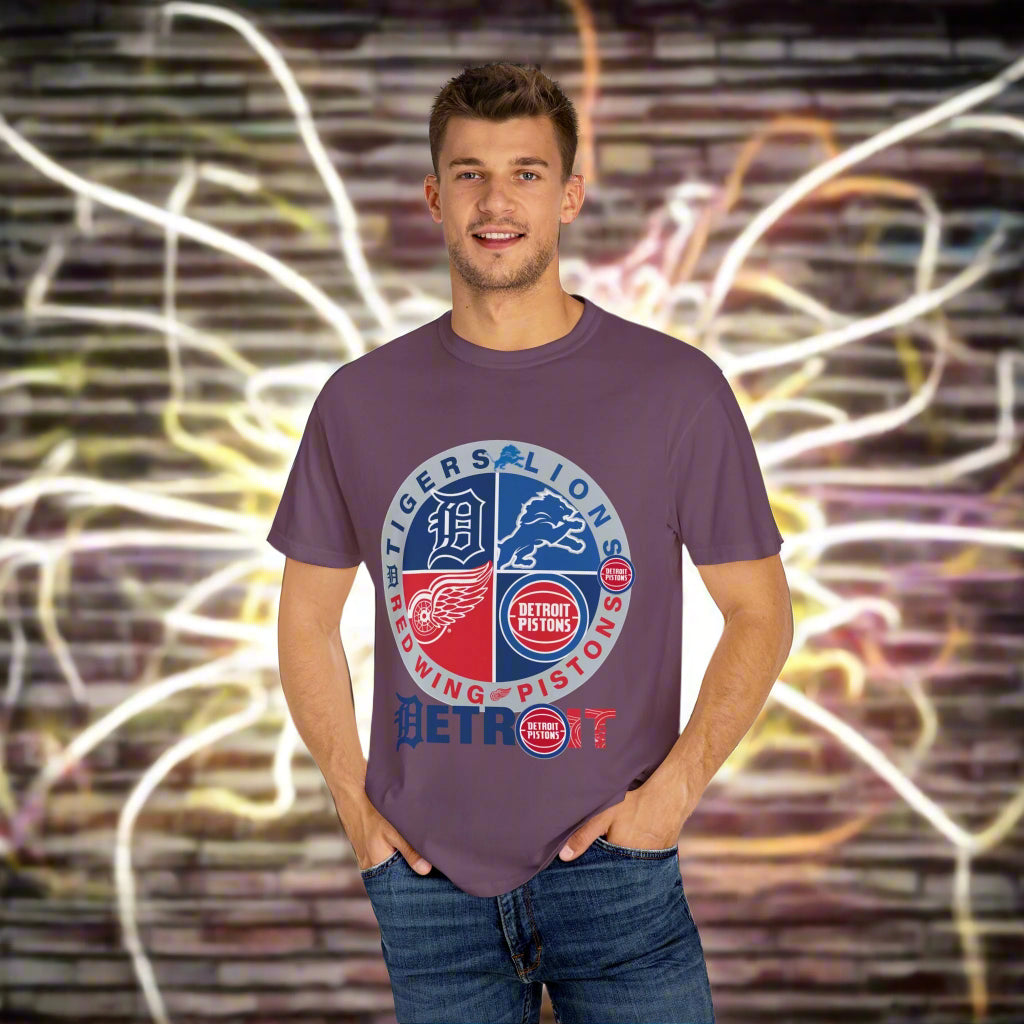 Introducing our: “Detroit Sports 4 Team” 100% cotton t-shirt featuring a unique and eye-catching design that is sure to make a statement. This t-shirt offers unbeatable comfort, breathability, and durability, ensuring a luxurious feel and long-lasting wear.
