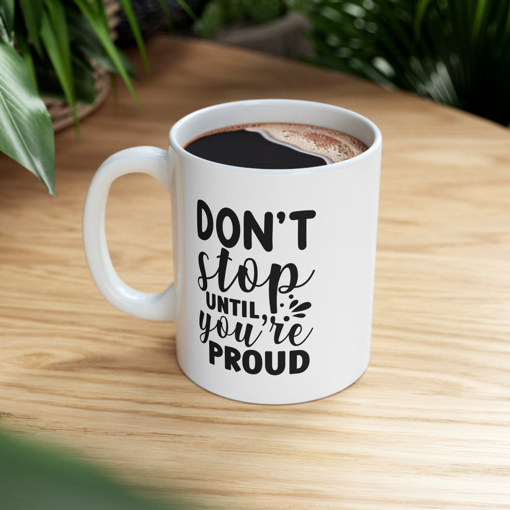 Introducing the Don't Stop Until You're Proud 11oz Mug Ceramic Coffee Mug. The perfect companion for your morning brew or afternoon pick-me-up. Crafted with care and precision, this classic coffee mug is designed to enhance your drinking experience while adding a touch of style to your kitchen or office space.